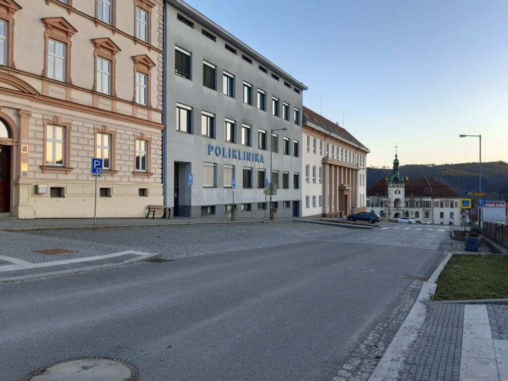 Parkování na náměstí před poliklinikou.