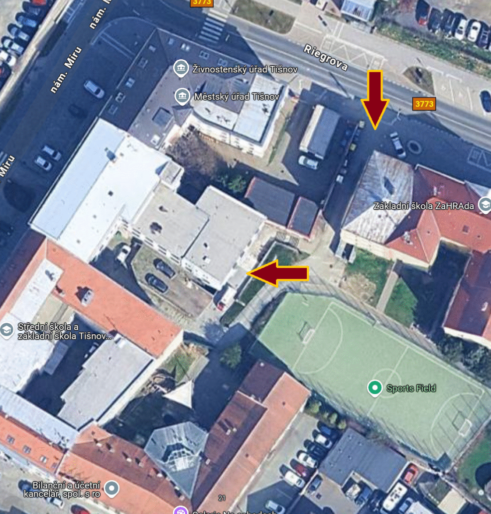 Bezbariérový přístup k výtahu je zezadu budovy (vjezd ulice Riegrova).